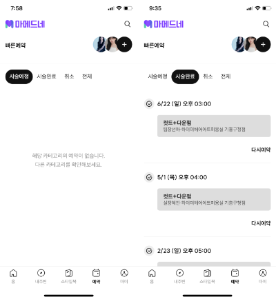 예약 탭에선 사용자에게 예정된 시술, 완료된 시술, 취소 내역 등을 열람하게 하는 기능을 수행하는데, 여기서 사용자는 이전에 예약하고 이용했던 메뉴 및 시술자에 대해 다시 재예약을 시도할 수 있다. 다만 기존에 예약했던 기록을 살펴보고 재예약을 결정할 수 있는 "시술완료" 탭이 굳이 해당 예약 탭에 배치되어 있어야 하는지에 대한 의문점이 존재한다.